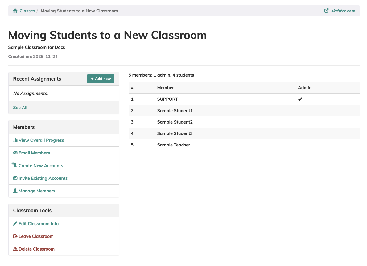 Once the teacher joins your classroom, you'll need to grant them Admin access, which will allow them to view other members and also move them to another classroom. Do this by going to the Manage Members page.