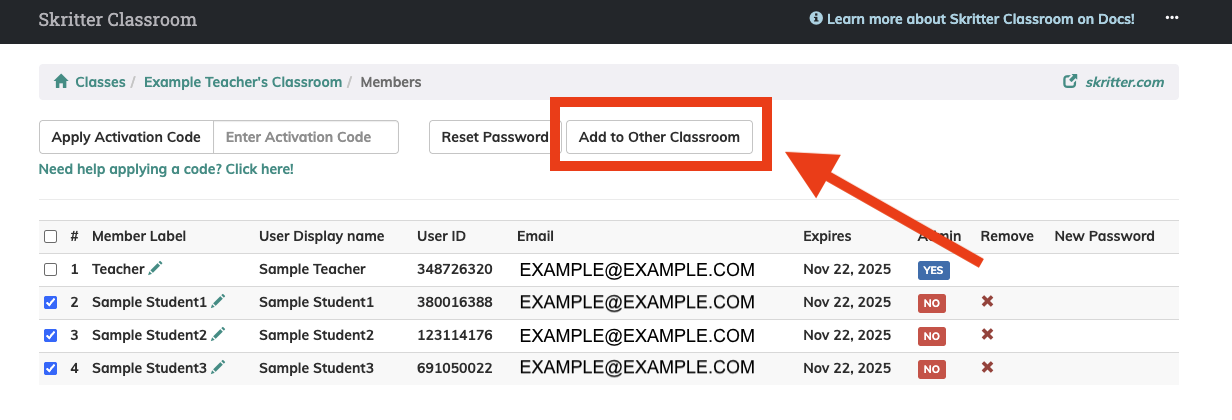 With the user accounts selected, press the "Add to Other Classroom" button at the top of the page.